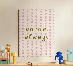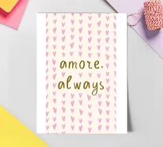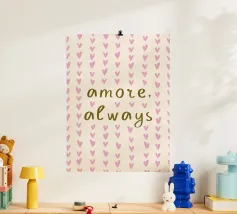 Diffondi amore e vibrazioni positive con questa affascinante stampa artistica tipografica. Caratterizzato dalla frase sincera "Amore, sempre" accanto a una dolce illustrazione con cuori, questo disegno è un bellissimo promemoria quotidiano per scegliere la compassione e la gentilezza. Il suo stile moderno e minimalista lo rende un pezzo versatile che si adatta a qualsiasi interno, da una camera da letto accogliente a un luminoso spazio abitativo. Quest'opera d'arte è perfetta per aggiungere un tocco di calore e un arredo ispiratore alla tua casa o come regalo premuroso per una persona cara.