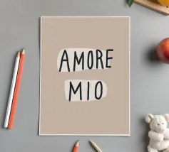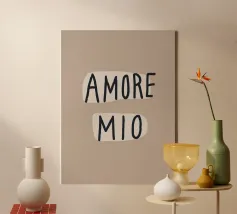 "Amore Mio", nelle morbide tonalità della terra, combina lo stile italiano e la tipografia moderna in un affascinante poster art déco. Questa bella stampa giocosa emana romantici sentimenti estivi ed è perfetta per le stanze di ispirazione boho. Con lettere di grandi dimensioni e un pizzico di Bella Italia, dona un tocco giocoso a qualsiasi stanza.