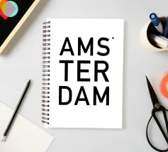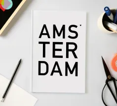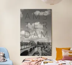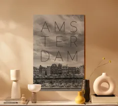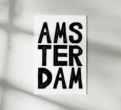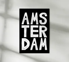 Adoro andare ad Amsterdam, nei Paesi Bassi. Adoro viaggiare in tutto il mondo. Adoro visitare le città, le montagne e il deserto. Tipografia in nero e bianco (trasparente). È possibile cambiare il colore dello sfondo. Poster tipografico minimalista di un viaggiatore.