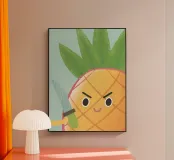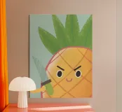 presenta un personaggio ananas con un'espressione arrabbiata/frustrata che tiene in mano un coltello.