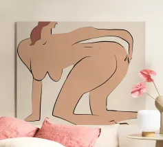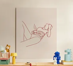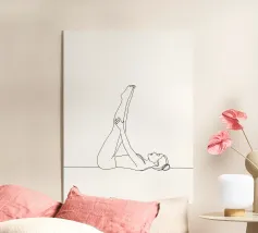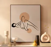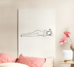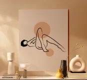 Illustrazione minimalista al tratto di una figura femminile reclinata, che cattura un senso di rilassamento e agio. I cerchi morbidi e dai toni terrosi aggiungono calore ed equilibrio alla composizione. Perfetto per chi ama un arredamento semplice, moderno ed elegante.