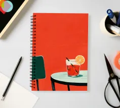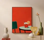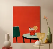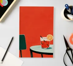 Un'illustrazione minimalista che cattura un tranquillo momento di aperitivo, con un bicchiere di cocktail rosso con guarnizione di agrumi su uno sfondo rosso intenso. Le forme pulite, il forte contrasto cromatico e la composizione rilassata evocano la sensazione di un caldo pomeriggio mediterraneo. Quest'opera d'arte conferisce un tocco moderno, elegante e leggermente giocoso agli interni contemporanei, alle cucine, alle sale da pranzo o agli spazi creativi.