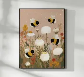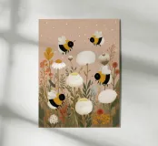 Un vivace gruppo di piccoli e soffici bombi volteggia delicatamente tra gli alti fiori di campo, creando con le loro ali morbide e le loro forme arrotondate una scena affascinante e giocosa. Con le loro calde strisce dorate e le delicate ali bianche, le api conferiscono movimento e dolcezza all'illustrazione.