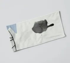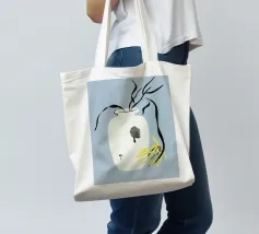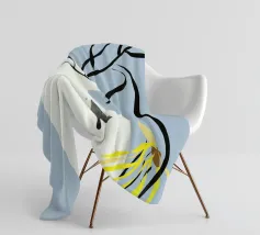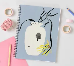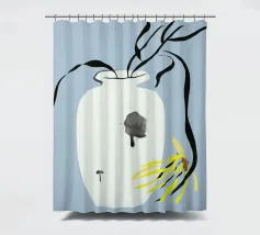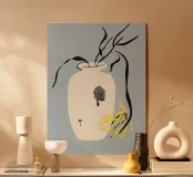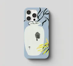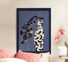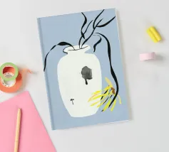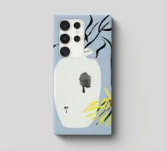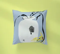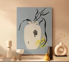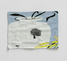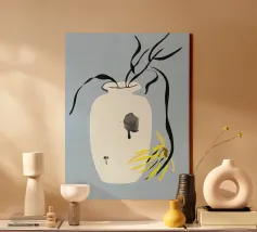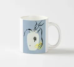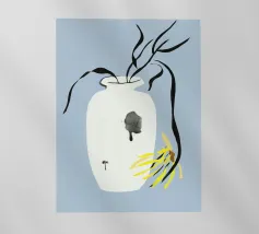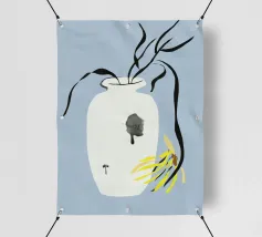 Un vaso bianco è raffigurato con lunghe foglie nere e una macchia di petali gialli, su uno sfondo azzurro. Il design è minimalista, con linee semplici e decise e un'attenzione particolare ai colori contrastanti.