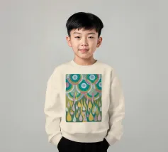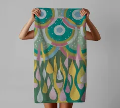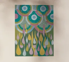 Un'ipnotica trama di gocce che cadono e forme organiche stratificate in blu e verde freddo, che ricorda una cascata o una pioggia scintillante. L'intricato disegno evoca un senso di movimento fluido e di tranquilla bellezza naturale.