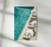 Una serena veduta aerea che cattura il fascino tranquillo di un bordo piscina incontaminato, dove ombrelloni bianchi fanno ombra all'acqua scintillante e turchese. La superficie morbida e increspata della piscina rispecchia la giornata luminosa, offrendo un senso di calma e svago. Questa opera d'arte moderna e minimalista evoca una fuga pacifica, perfetta per chi desidera un momento di quiete in mezzo al brusio della vita quotidiana. Un'aggiunta elegante a qualsiasi spazio contemporaneo, dove il relax incontra lo stile.