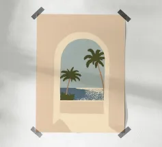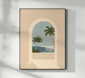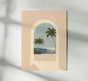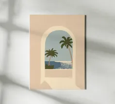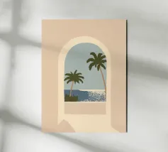 Una tranquilla vista costiera incorniciata da un morbido arco architettonico. Due palme si protendono delicatamente verso un mare blu e calmo, dove la luce del sole brilla sull'acqua sotto un cielo plumbeo. I toni caldi del beige dell'arco contrastano magnificamente con i toni freddi del blu dell'oceano, creando una composizione equilibrata e pacifica.