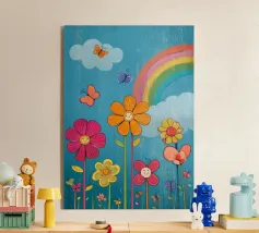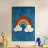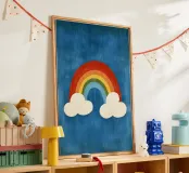 L'immagine mostra un arcobaleno stilizzato con sei archi colorati - dal rosso all'azzurro - su uno sfondo blu strutturato. Alle estremità dell'arcobaleno si trovano due nuvole bianche, che danno al motivo un tocco giocoso. Lo stile è chiaro, grafico e infantile, con colori vivaci e forme semplici che conferiscono un'atmosfera amichevole e ottimista. Ricorda le illustrazioni dei libri per bambini o i progetti per messaggi positivi e inclusivi.