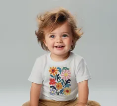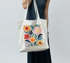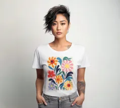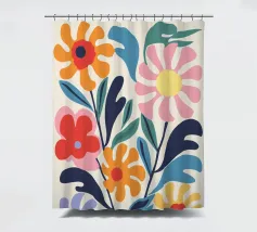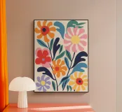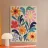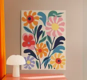 Questa opera d'arte floreale combina colori vivaci come l'arancione, il giallo, il rosa e il blu per creare un insieme armonioso. La rappresentazione astratta di fiori e foglie conferisce eleganza moderna e vivacità a qualsiasi ambiente. Perfetto per murales, cuscini o accessori per la casa, per abbellire con stile la vostra casa e creare un'atmosfera allegra. Un must per gli amanti del design che desiderano creare accenti colorati.