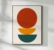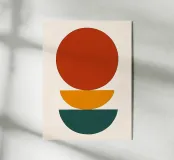 Una moderna composizione geometrica caratterizzata da forme circolari e semicircolari impilate nelle calde tonalità del rosso, dell'arancio e del verde scuro. Questo design astratto e minimalista aggiunge un tocco elegante ed equilibrato ai vostri interni.