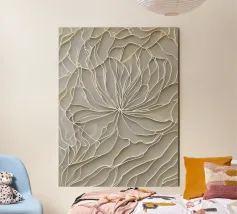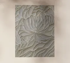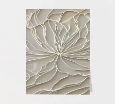Questa intricata opera d'arte presenta una delicata rete di linee che crea un senso di profondità e movimento. I toni morbidi e neutri evocano una sensazione di tranquillità e pace.