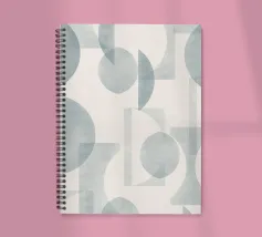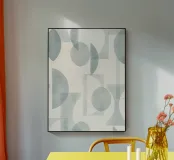 Il disegno presenta un'accattivante disposizione di cerchi, rettangoli e forme astratte di foglie sovrapposte, che alludono sottilmente a forme organiche all'interno della struttura. La texture granulosa aggiunge profondità e interesse visivo.