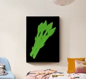 Una vivace illustrazione raffigura un mazzo di asparagi verdi. Il colore verde brillante degli asparagi contrasta nettamente con lo sfondo scuro, evidenziando le linee semplici e pulite del disegno.