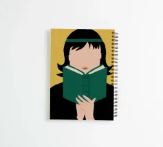 A portrait of a person with a black bob haircut, completely absorbed in the green book they are reading. The faceless style focuses the viewer's attention on the act of reading and quiet contemplation.