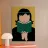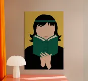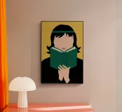 Ritratto di una persona con un taglio di capelli nero a caschetto, completamente assorta nel libro verde che sta leggendo. Lo stile senza volto focalizza l'attenzione dello spettatore sull'atto della lettura e sulla tranquilla contemplazione.