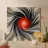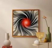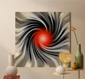 Abstrakte, dynamische Komposition mit wirbelnden Linien in Schwarz und Grau , die auf ein leuchtend rotes Zentrum (Kugel) zulaufen. Das Motiv vermittelt Bewegung und Energie.