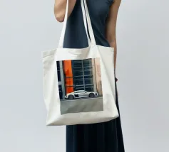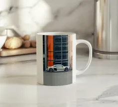 Un poster elegante e minimalista con un'Audi R8 argentata in città, un'auto sportiva moderna che fonde perfettamente l'eleganza classica con l'alta velocità.