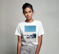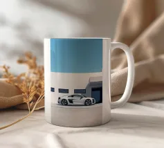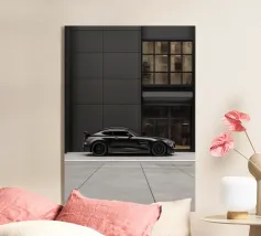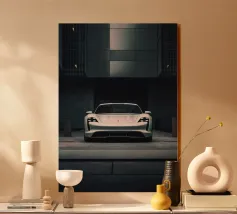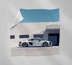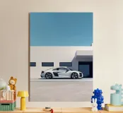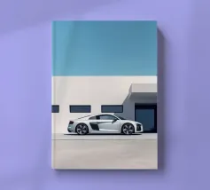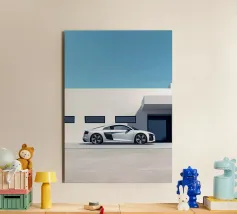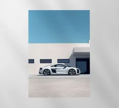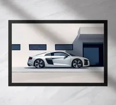 Un poster minimalista con un'Audi R8 bianca, un'auto sportiva moderna che fonde perfettamente il design classico con un elegante minimalismo.