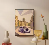 Illustrazione di un'auto d'epoca davanti a un edificio storico con uno stile geometrico moderno.