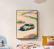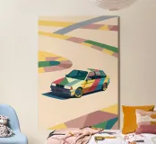 Get an illustration of a colorful hatchback car on the road with a modern geometric style.