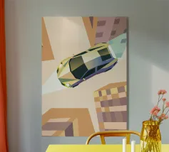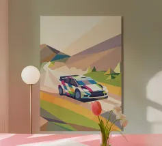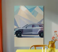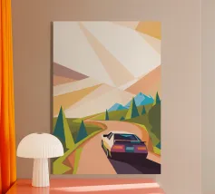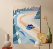 Illustrazione di un'auto che guida nella neve con uno stile geometrico moderno.