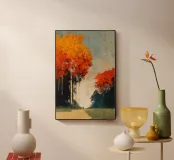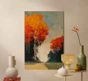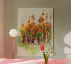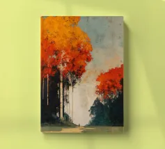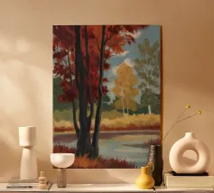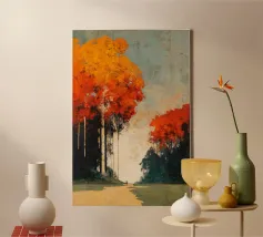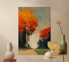 Un momento fugace sotto gli alberi infuocati. Autumn Encounter cattura la tranquilla intimità di due figure in piedi sotto una cattedrale di fogliame autunnale. Con i suoi rossi intensi, i ricchi ocra e i verdi profondi che si fondono in un cielo dalla trama morbida, quest'opera d'arte parla di presenza, pausa e connessione. Perfetta per gli interni moderni che abbracciano il minimalismo emotivo, invita alla riflessione senza bisogno di parlare.