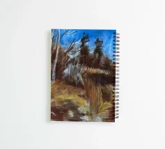 In questo paesaggio pastello disegnato a mano, il calore dell'autunno prende vita con montagne, alberi e rocce. Una sinfonia di colori autunnali dipinge la natura in una serena tranquillità.