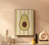 Una dolce e semplice illustrazione di mezzo avocado su uno sfondo a griglia rosa pastello. Perfetta per le pareti di asili nido, stanze di bambini o decorazioni giocose per la cucina. I colori tenui e il design amichevole lo rendono ideale per creare uno spazio allegro e accogliente.