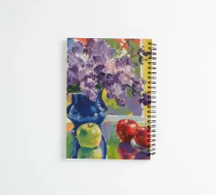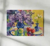 Una vivace composizione di natura morta con profumati lillà viola in un vaso blu intenso, accanto a un vaso blu più piccolo, mele verdi e limoni gialli, il tutto su un allegro sfondo giallo.