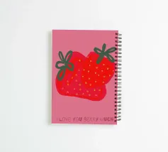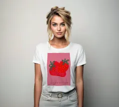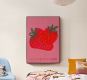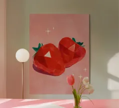 Fragole rosse su sfondo rosa con un gioco di parole pieno di fascino. Fruttata, giocosa e spiritosa: una stampa che esprime l'amore in modo leggero e dolce. Ideale come regalo o come oggetto di rappresentanza che diffonde il buon umore e fa sorridere i cuori.