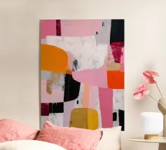 "XOXO" - un'allegra illustrazione artistica dai colori vivaci che celebra l'amore e gli abbracci! Il dipinto acrilico astratto combina motivi vivaci in rosa, azzurro e arancione, con pennellate dinamiche e pois che creano un movimento giocoso. Perfetto per una stanza moderna ed estiva!