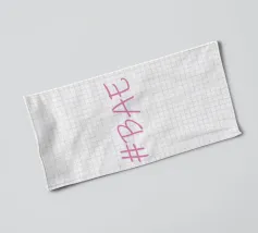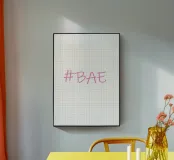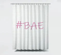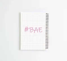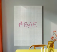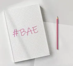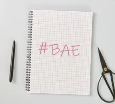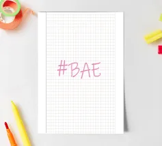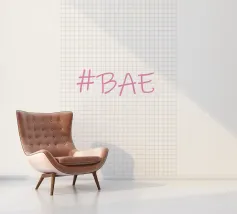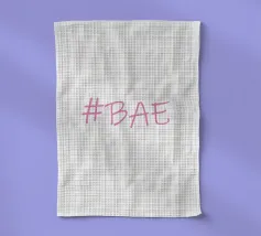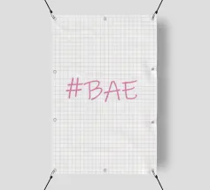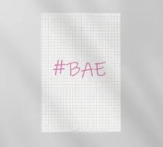 Questa immagine è un design grafico semplice e moderno con l'hashtag "BAE" in un font rosa tenue in stile scrittura.
