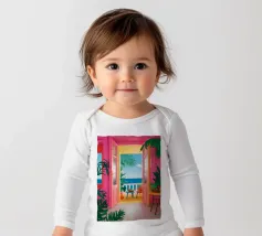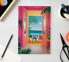 Da una stanza dalle pareti rosa, attraverso una porta aperta, si accede a un balcone con tavolo e sedie, che offre una vista serena e invitante sul mare blu.