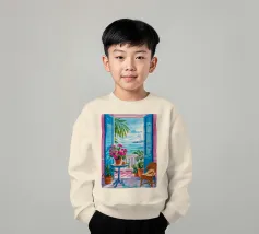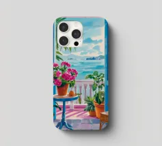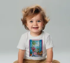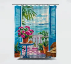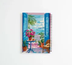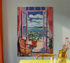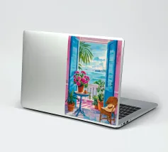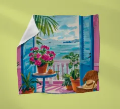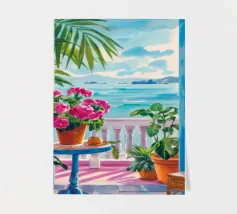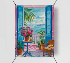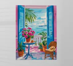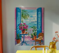 Una vista da un balcone con una chitarra e una sedia, che si affaccia su un mare bellissimo e ventilato con barche a vela. La scena rappresenta perfettamente una vacanza rilassata, creativa e idilliaca sulla costa.