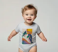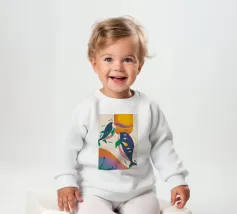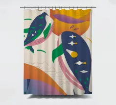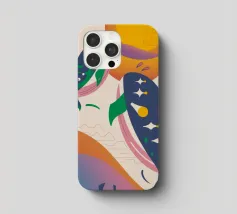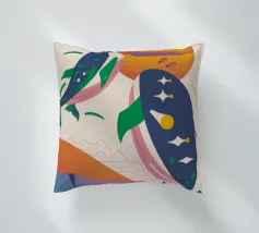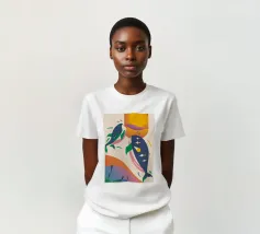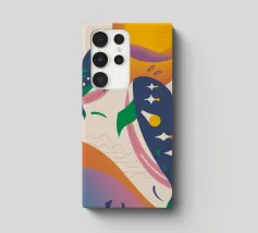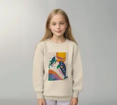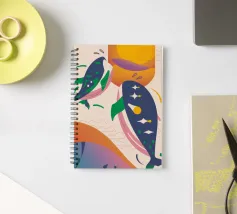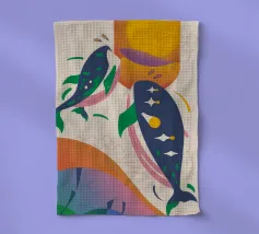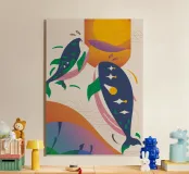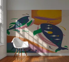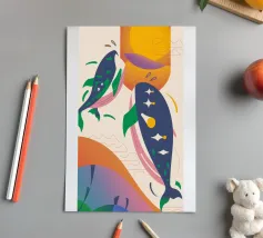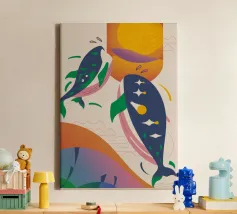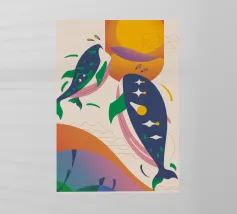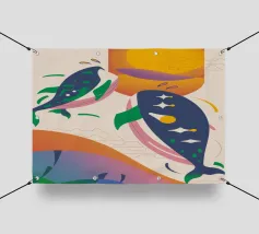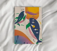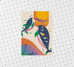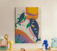 Questa immagine illustra due balene che nuotano verso l'alto con uccelli che volano intorno a loro. Lo sfondo comprende forme e colori astratti, che conferiscono un'atmosfera stravagante.
