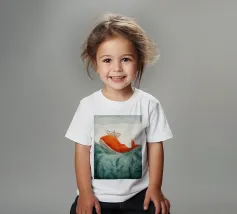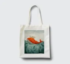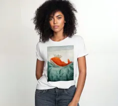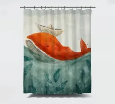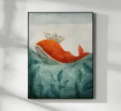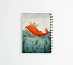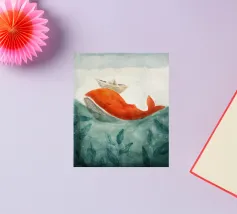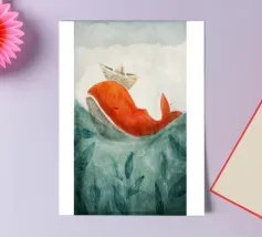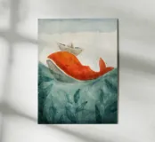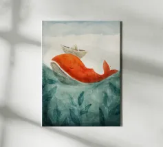 Una stravagante illustrazione ad acquerello che raffigura una serena balena rossa che scivola tra le onde dell'oceano, trasportando una delicata barchetta di carta sul dorso. Le texture morbide e le tonalità sognanti creano una scena tranquilla e poetica, evocando un senso di meraviglia, immaginazione e pacifica avventura sotto il cielo aperto.