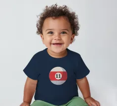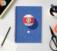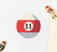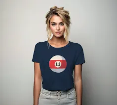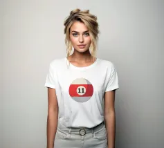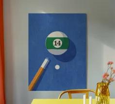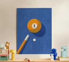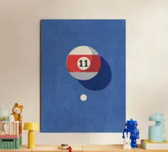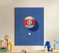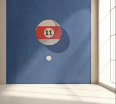 Questa illustrazione minimalista mostra la palla da biliardo rossa e bianca numero 11 che fluttua a fuoco su uno sfondo blu intenso. Sotto di essa, una palla bianca più piccola suggerisce il movimento e l'eccitazione del gioco. Il design pulito e la palette di colori retrò conferiscono all'immagine un'estetica elegante e moderna, ideale per gli appassionati di biliardo e di arte geometrica.