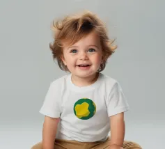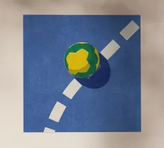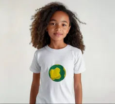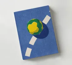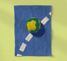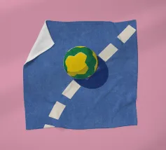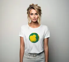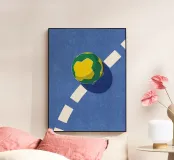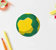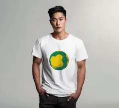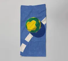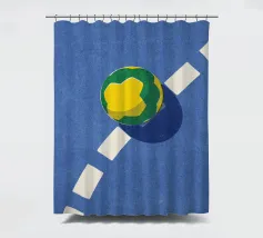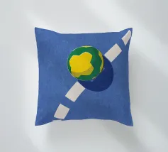 This colourful handball design features a yellow-green ball on a blue playing field, with curved white lines that convey movement and dynamism. The bold shadow of the ball adds depth, while the vibrant colours and minimalist design create a sporty and energetic atmosphere. Ideal for fans of handball and retro sports designs.