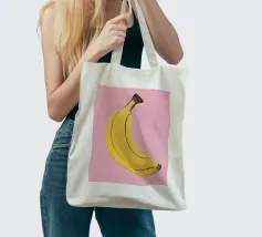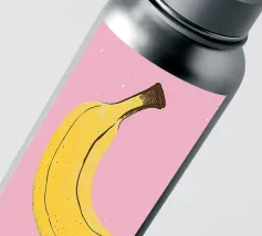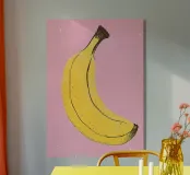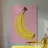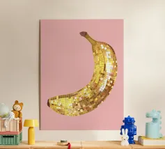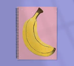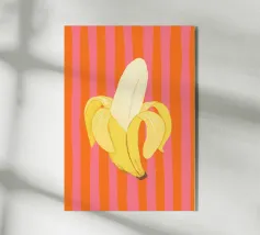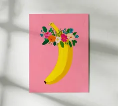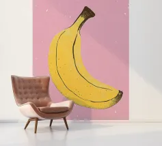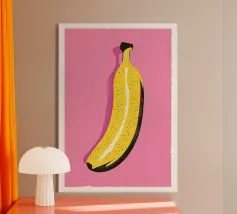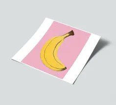 Una banana, stampa Risograph con texture granulosa, una semplice illustrazione piatta in stile arte vettoriale, su sfondo rosa, stampata con inchiostro Risograph.