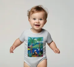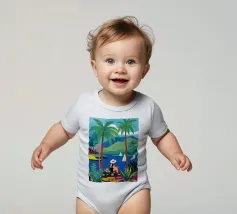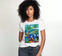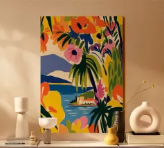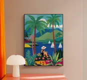 Illustrazione di una vivace baia tropicale con barche a vela sull'acqua, incorniciata da piante rigogliose e palme. La scena è una rappresentazione bella, vivace e idilliaca di una perfetta destinazione costiera.