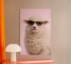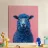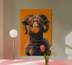 Un'immagine sorprendente di una pecora blu surreale con lana strutturata, che si staglia su uno sfondo rosa brillante. L'audace contrasto cromatico e la composizione minimalista creano un'estetica giocosa e moderna.
