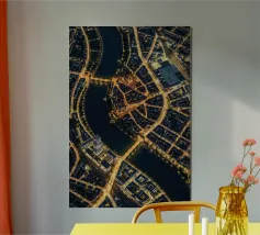 Questa spettacolare veduta aerea mostra Basilea sul Reno. Il fiume scuro separa i quartieri luminosi della città, collegati da ponti illuminati. La moderna Torre Roche e la storica cattedrale spiccano nel mare dorato di luci della struttura urbana.
