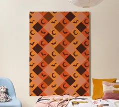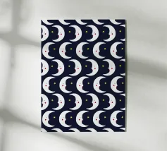 I pipistrelli dei cartoni animati con facce sorridenti volano su uno sfondo blu-verde disseminato di piccole stelle. Il design giocoso crea un'atmosfera stravagante e divertente.
