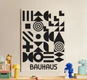 Un poster astratto in bianco e nero, ricco di immagini, caratterizzato da una composizione densa, apparentemente casuale ma strutturata di elementi geometrici che si intersecano. Il disegno è pieno di forme diverse, tra cui quadrati pieni, triangoli, semicerchi, anelli, strisce e cerchi concentrici. Questa complessità celebra le forme fondamentali e i principi di design modulare della scuola Bauhaus e del modernismo astratto. La parola "BAUHAUS" è centrata in grassetto in basso, in un carattere sans-serif pesante e arrotondato. Questo download digitale ad alta risoluzione (7000x5000 pixel, 300 dpi) garantisce una riproduzione nitida e di qualità museale.