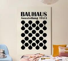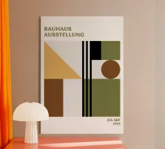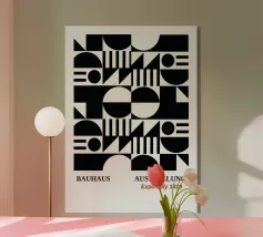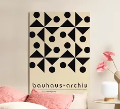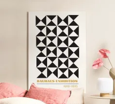 Questo poster d'arte astratta, che si rifà all'epoca del Bauhaus (1919-1933), presenta un avvincente disegno geometrico. Quattro grandi forme sono composte da triangoli intricati e allineati, utilizzando motivi verticali e orizzontali in nero su uno sfondo chiaro. Il gioco di linee crea una struttura visiva e una forma che incarna i principi grafici del Bauhaus. Prodotto come arte digitale di alta qualità a 7000x5000 pixel e 300 dpi, questo poster garantisce dettagli nitidi e linee nette per un'opera d'arte di qualità.