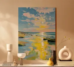 A golden stretch of silky sand extends far and wide, embracing the turquoise sea like a precious gem. The radiant sunlight kisses the shore, casting shimmering streaks that glisten like gold. Gentle waves whisper softly, like a melodious song of the ocean. The scene unfolds a tranquil, romantic beauty—where time seems to stand still, and the soul becomes one with the vastness of nature.