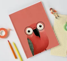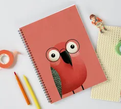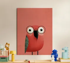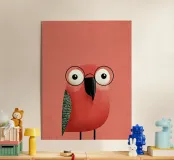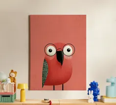 Un'illustrazione minimalista e giocosa che raffigura un uccellino pensieroso con occhiali oversize, su uno sfondo caldo e materico. Le forme pulite, gli occhi espressivi e la palette di colori tenui creano un delicato senso di curiosità e tranquilla intelligenza.