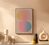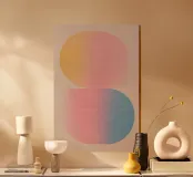Due forme semicircolari collegate da dolci sfumature di colore rosa, giallo e azzurro: quest'opera d'arte minimalista irradia leggerezza, armonia e calma. Ideale per ambienti luminosi e moderni, camere per bambini o interni di ispirazione scandinava. I tenui colori pastello donano calore ed equilibrio a qualsiasi parete.