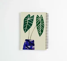 Una coppia di foglie verdi stilizzate con venature bianche prominenti si estende da sottili steli marroni. Emergono da un vaso con motivi blu e viola, creando una rappresentazione moderna e semplicistica di una pianta in vaso.