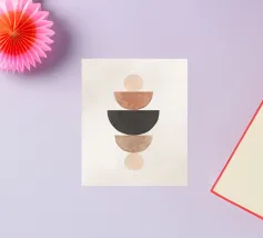 Aggiungete un tocco di fascino minimalista al vostro spazio con questa vibrante stampa d'arte astratta moderna di metà secolo, caratterizzata da un'ipnotica miscela di forme geometriche e fluide di acquerello su uno sfondo neutro morbido e cremoso. Con la sua calda atmosfera scandinavo-giapponese, non è solo arte: è un'atmosfera.